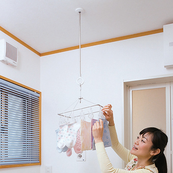 さらに洗面室にも1本の取り外し物干しがあり、折りたたみ式の物干しハンガーを広げたりと、