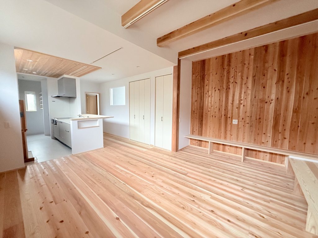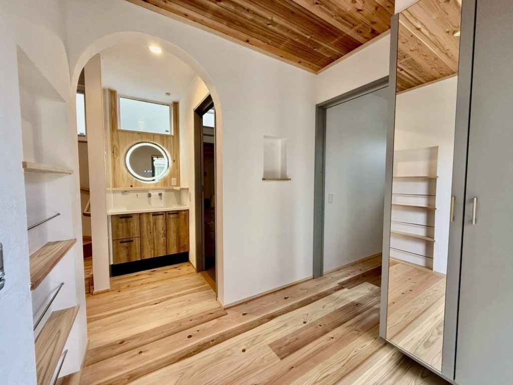 玄関から見える可愛らしいアーチ壁や、アクセントとして採り入れた室内の板貼りが、木の家ならではの温もりと心地よさを生み出します。