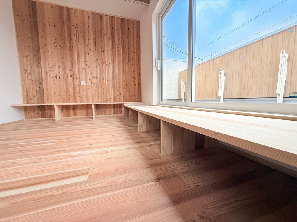 窓際に造り付けた長いベンチは、みんなで並んでおしゃべりしたり、一人で読書を楽しんだり、多目的に使える憩いのスペースです。