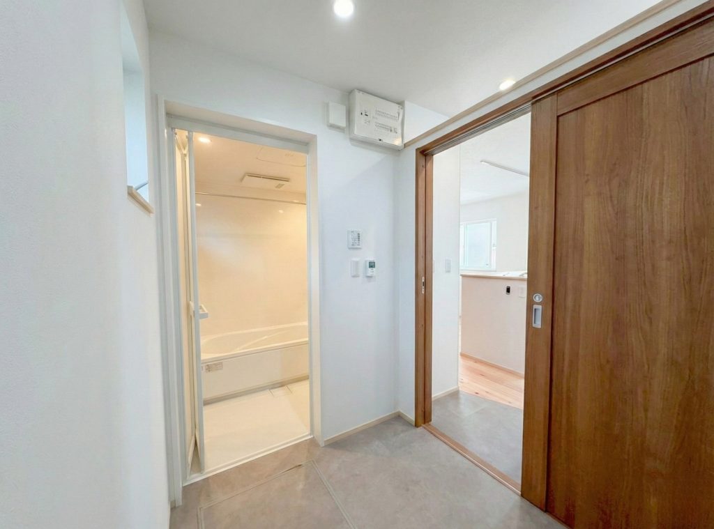リビングのエアコン設置場所を工夫し、洗面室との間仕切り上部をオープンにすることで室内の温度を共有できるように設計しました 。