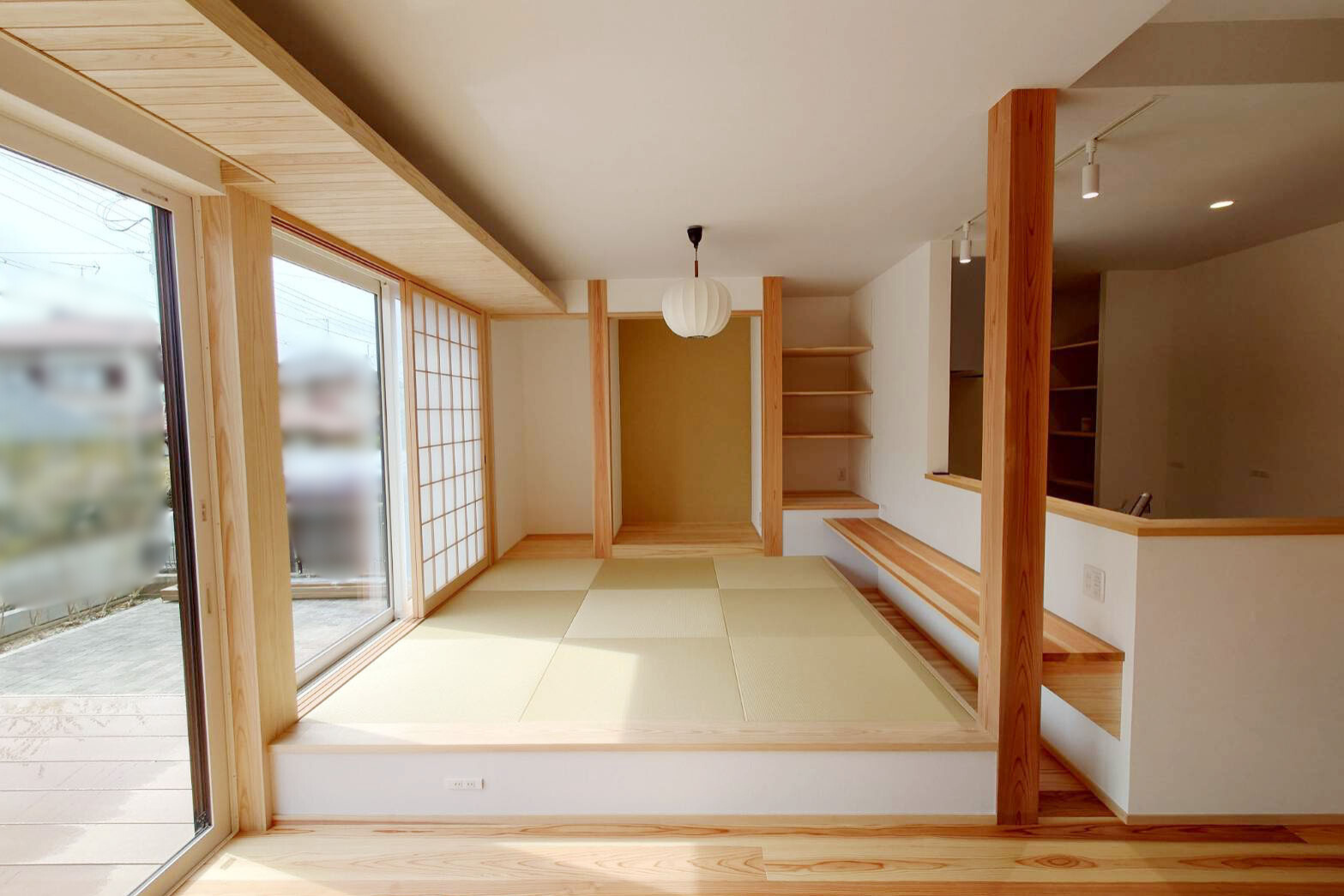 小上がりの畳からは大開口サッシを通し、庭の木々が眺められます。 ウッドデッキと直接繋がり、開放的な空間となっています。